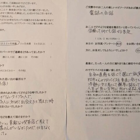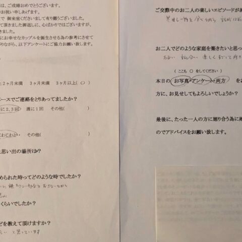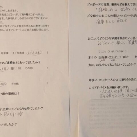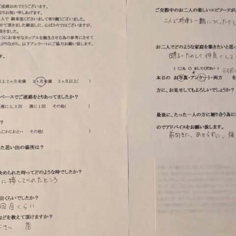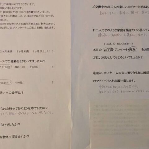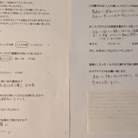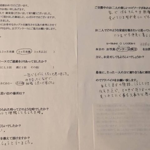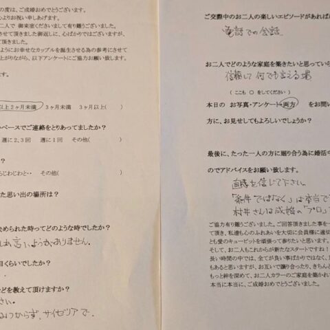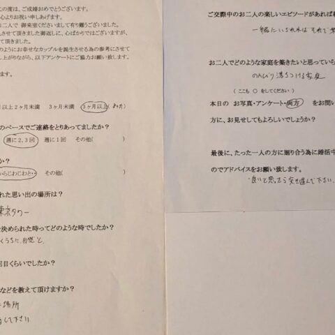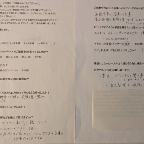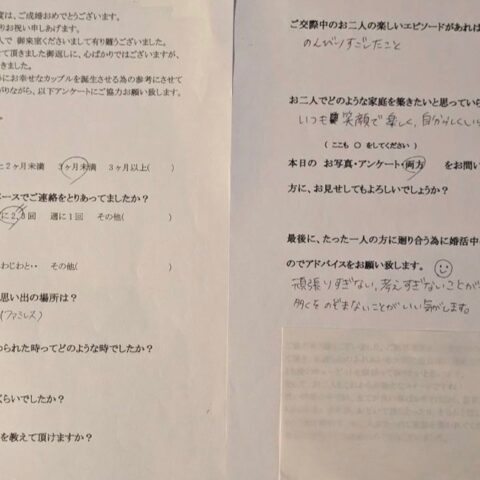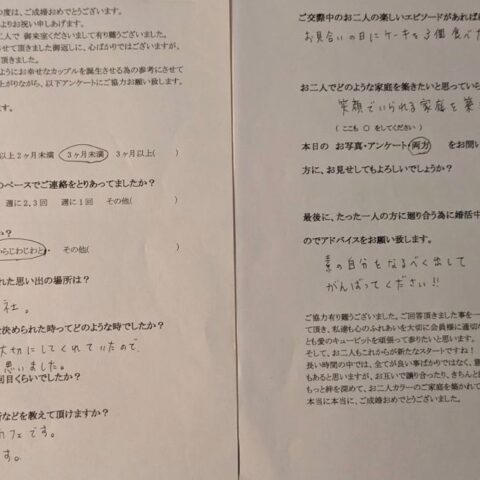 T.M様この度は、ご成婚おめでとうございます。 ご交際期間は?8ヶ月 ご交際中は、どれくらいのペースで連絡をとられていましたか?週に2,3回 第一印象は如何でしたか?後からじわじわと… ご交際中お二人で行かれた思い出の場所は?アクアパーク品川、東京...