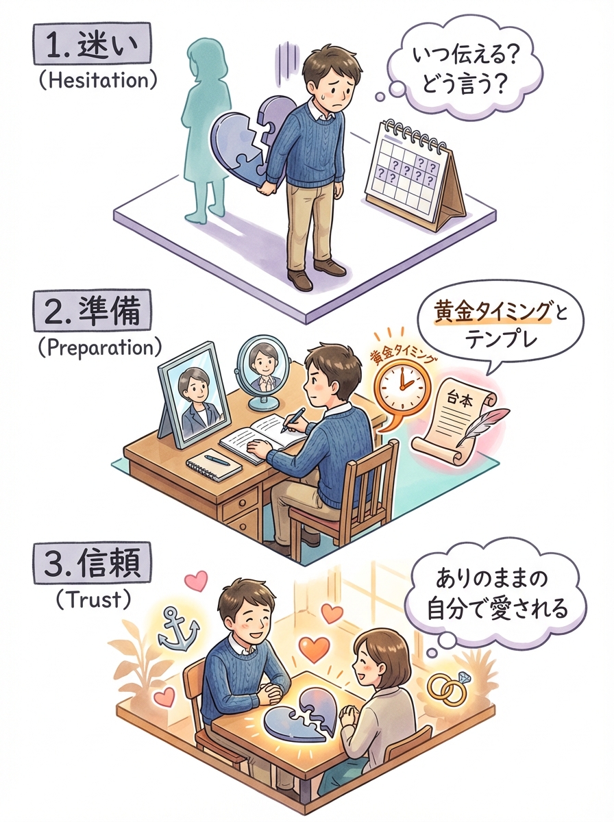 話し方の基本は、「導入→事実→学び→未来」という4つのステップで構成することです。まず「あなたを大切に思っているからこそ伝えたい」と前置きし、離婚の事実を客観的に伝えます。続けて、その経験から何を学び、今の自分がどう変化したかを語り、最後に「あなたとどう歩みたいか」という未来の話で締めくくります。