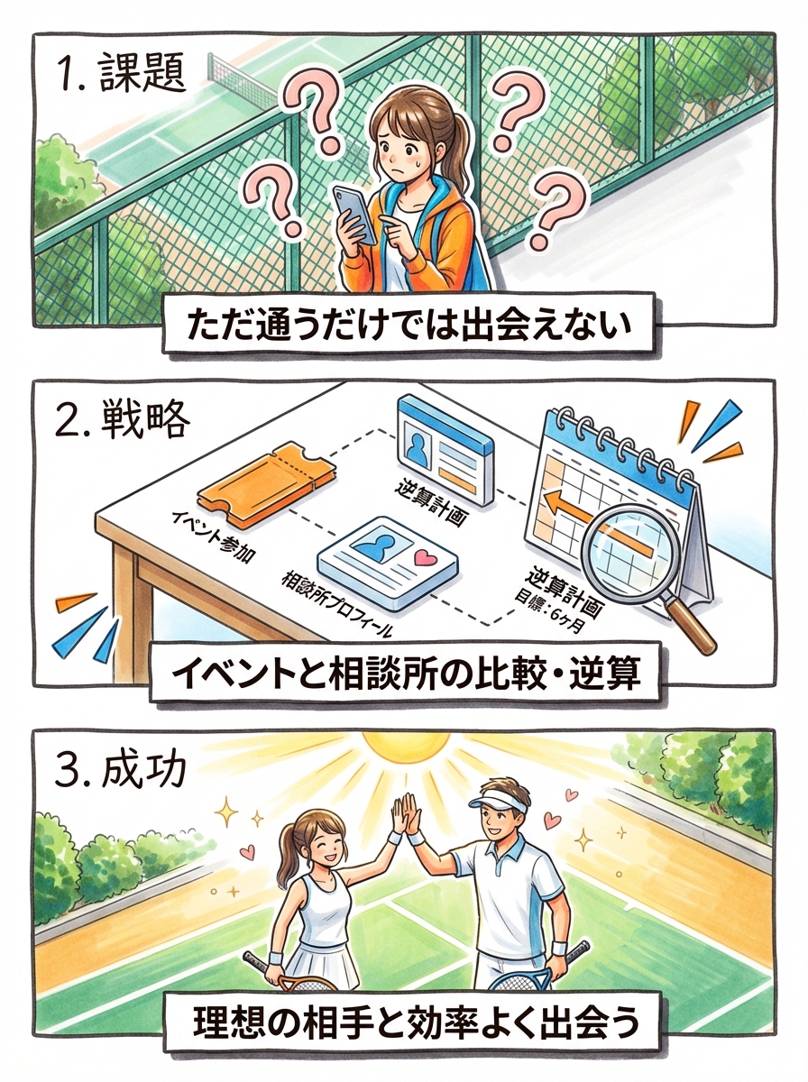 単に「テニスが好き」という条件だけでなく、どの程度の頻度で、どんなライフスタイルを望むか。この「深掘りしたヒアリング」ができるカウンセラーが在籍しているかを確認してください。